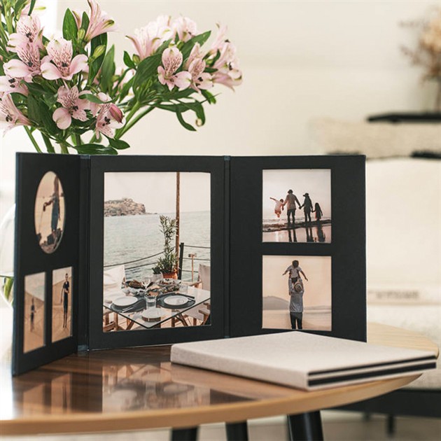 Veckla ut albumet och skapa ett trepaneligt galleri – perfekt för bord, hylla eller mantel. 🎉