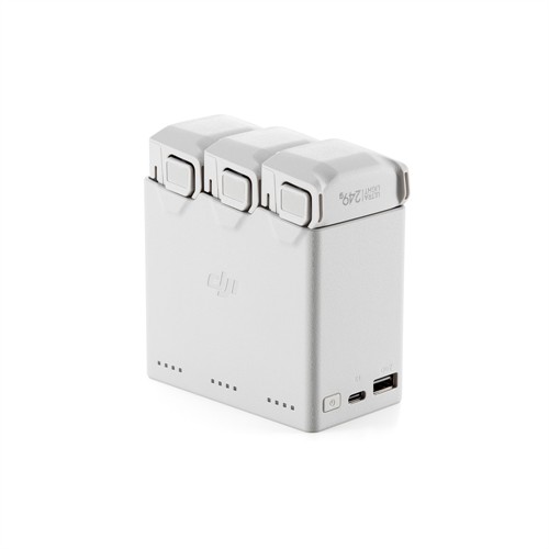 Denna tvåvägsladdningshubb gör det möjligt att ladda upp till tre batterier i följd, samtidigt som den även kan ladda fjärrkontrollen. Dessutom fungerar den som en portabel strömkälla för andra USB-enheter, samt erbjuder en praktisk lösning för att transportera och förvara dina batterier.