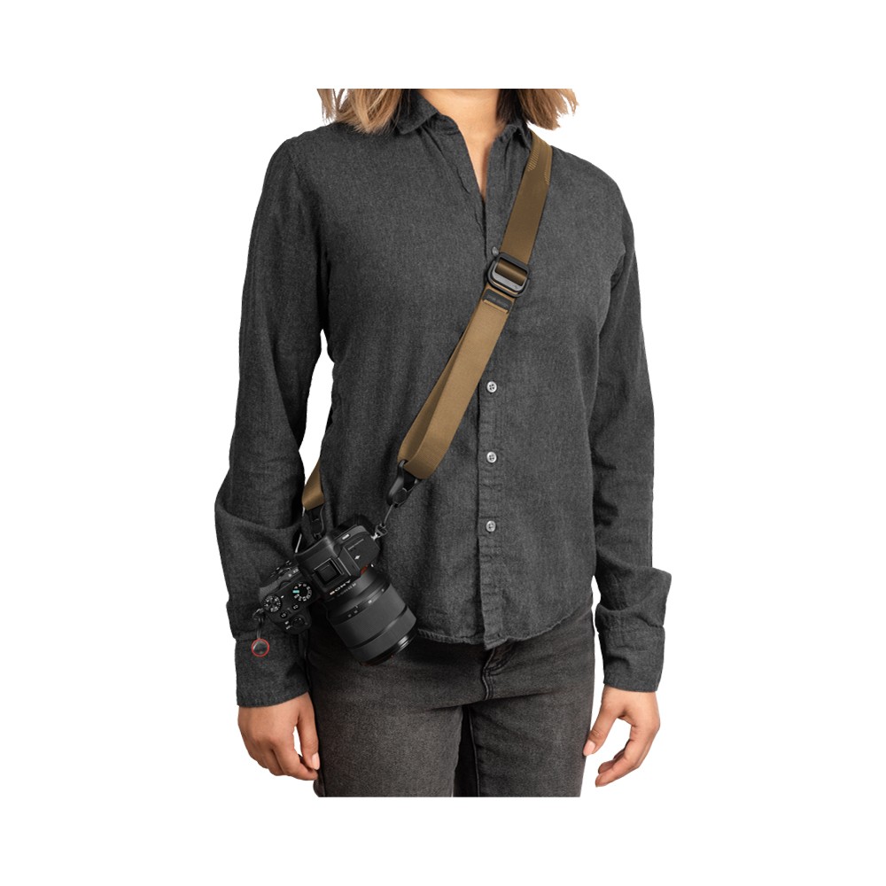 Slide Lite kan användas som axelrem, nackrem eller sele. Ena sidan är slät och glider lätt över kläder, medan den andra har silikon som håller remmen på plats. Dubbla snabbjusteringar gör det enkelt att anpassa remmen för alla aktiviteter. När du inte fotograferar kan kameran fästas tätt mot kroppen för säker transport.