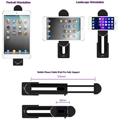 Universalhållare för att fästa surfplatta och mobil på fotostativ