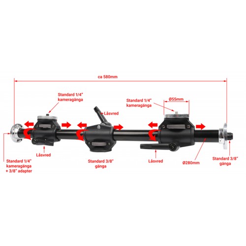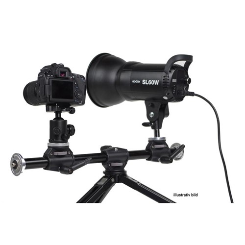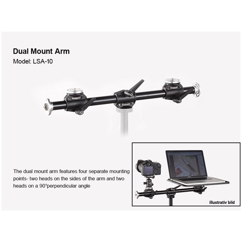 Godox LSA-10 Dual Mount Arm är en praktisk och robust tillbehörsarm för montering på stativ. Armen har två flytt- och roterbara huvuden (med 1/4" kameragänga), samt även fästen i vardera ände av stången. Istället för att använda flera stativ, så kan man alltså tack vare armen montera flera tillbehör på ett och samma stativ och på så sätt spara utrymme. Vanliga kombinationer är t.ex kamera och laptop-platta, kamera och smartphone-hållare eller t.ex kamera och belysning. (Tillbehören som räknas upp ingår ej.) De flyttbara huvuden kan skjutas fram- eller bakåt på armen och även roteras runt stången. Godox LSA-10 Dual Mount Arm kan också användas för t.ex macro- eller produktfotografering då man vill kunna plåta rakt ovanifrån. Armen har en längd på cirka 60cm och är tillverkad i aluminium.