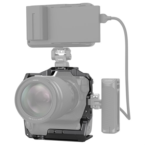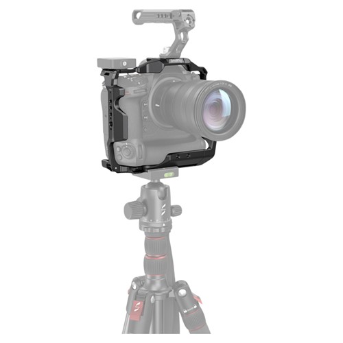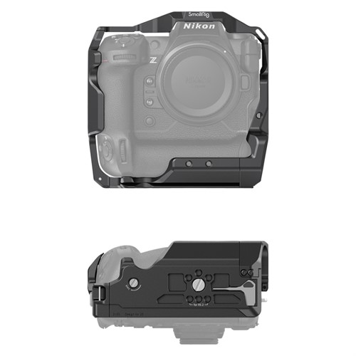 Designad för att ge möjlighet att fästa tillbehör samt ge ett skydd för Nikon Z9. Cagen monteras på kameran med en 1/4''-20 skruv & monteringsstift i botten och hålet för axelremmen på höger sida.