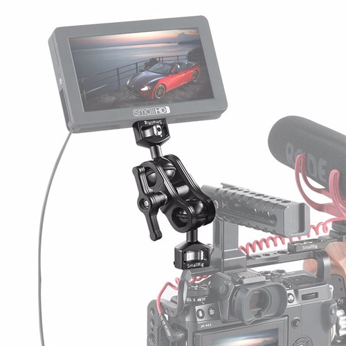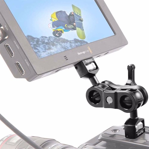 Den kan monteras på en cage med 1/4"-20 gängade hål eller topplatta med 1/4"-20 gängade hål. Den har en låsskruv i varje ände för att kunna låsa manuellt. Perfekt för att exempelvis fästa en monitor på en cage. Den monterade monitorn kan justeras i olika positioner och vinklar via både kullederna och klämman, och den låses via en enda vingmutter.