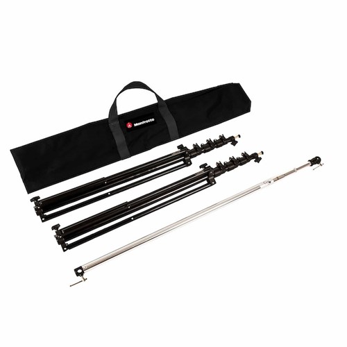 Manfrotto bakgrundstativ bestående av två stativ, utdragbar bom samt väska. Gör det enkelt att snabbt sätta upp en mobil fotostudio med tygbakgrund eller pappersbakgrund. Tack vare den telskopiska bommen kan längden anpassas efter tygets eller pappersrullens bredd. Bommens längd är 1,12 m till 2,98 m. Stativen har ställbar höjd 0,9 m till 3,1 m.