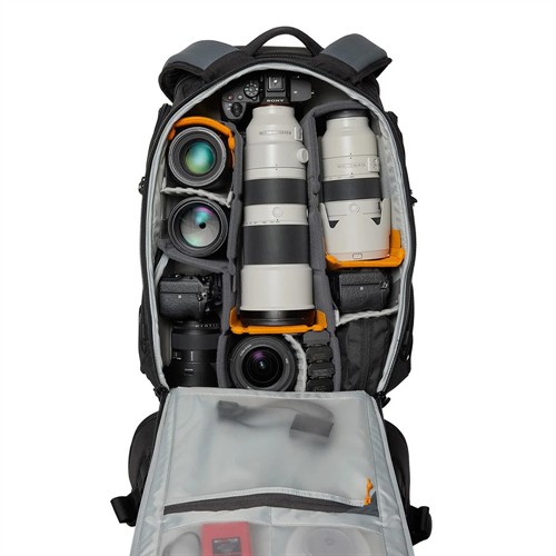 ProTactic BP 450 AW III är utformad för att möta de krävande behoven hos professionella fotografer som arbetar i olika miljöer. Den har fyra åtkomstpunkter, inklusive dubbla sidodörrar för snabb åtkomst, en bred toppåtkomst för längre objektiv och full åtkomst baktill för omfattande organisering av utrustningen. Detta gör den idealisk för fotografer som snabbt måste kunna anpassa sig till olika fotograferingsscenarier.