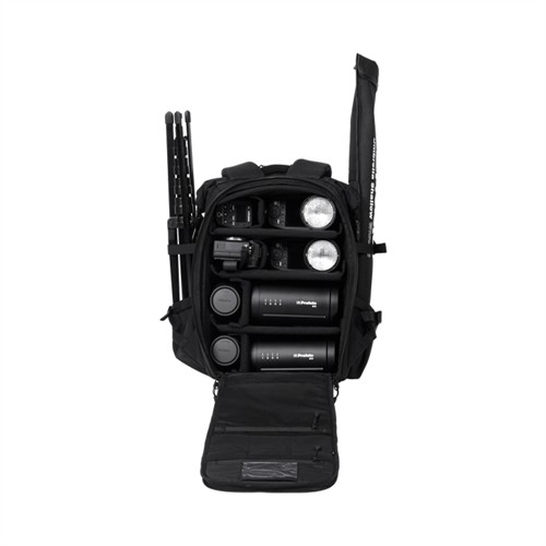 Sidorna har fickor och remmar för att fästa stativ eller små belysningsstativ. Ryggpanelen har dessutom en genomgående ärm för trolleyhandtag, vilket gör det enkelt att kombinera med resväska. De vadderade axelremmarna, bröstremmen och topp-sidhandtagen ger maximal komfort och flexibilitet.