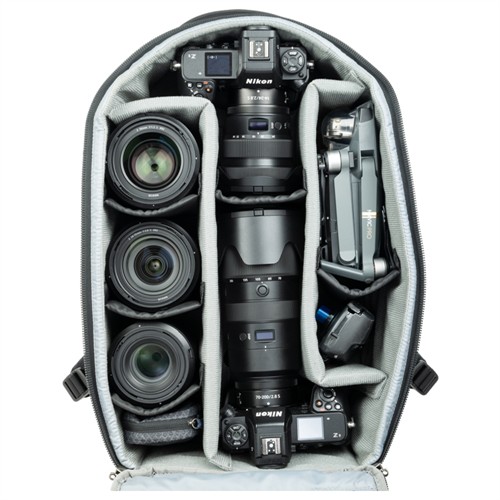 Två systemkameror med grepp med objektiv monterade samt ytterliggare 4-6 standard objektiv. Plats för upp till 16" laptop. Rymmer exempelvis objektiv upp till 200-400 f/4 omonterad. Regnskydd medföljer.