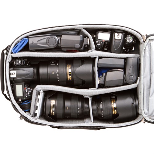 Exempel på utrustning som ryms är: En systemkamera, 16-35, 85mm, 100mm makro, 70-200, 24-70, Speedlite blixt och telekonverter. Samt mindre tillbehör såsom laddare, kablar, minneskort och anteckningar.