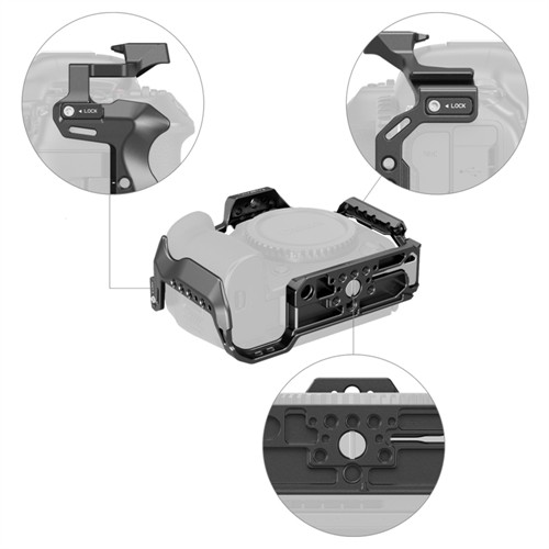 Cagen har flera 1/4”-20 gängade hål och 1/4”-20 monteringshål för kompatibilitet med extra tillbehör som SmallRig sidohandtag, magiska armar, monitorfästen, Manfrotto basplattor och L-formade monteringsplattor. Den har också ett tillbehörsskofäste för montering av mikrofoner och belysningstillbehör.