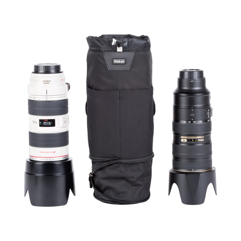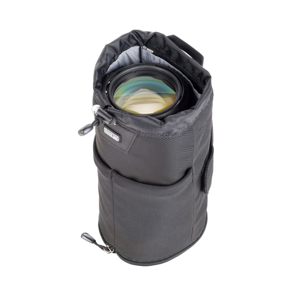 Den modulära objektivpåsen är anpassad för att rymma ett 70–200 mm f/2,8-objektiv med motljusskyddet omvänt eller i fotograferingsläge när påsen är utfälld. Den ger säker förvaring och snabb åtkomst för fotografer som arbetar i rörelse.